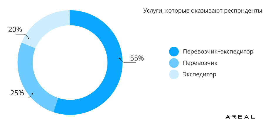 25% участников — перевозчики, 20% — экспедиторы, 55% — компании, которые предоставляют как услуги перевозчика на собственных и арендованных активах, так и услуги экспедитора.
