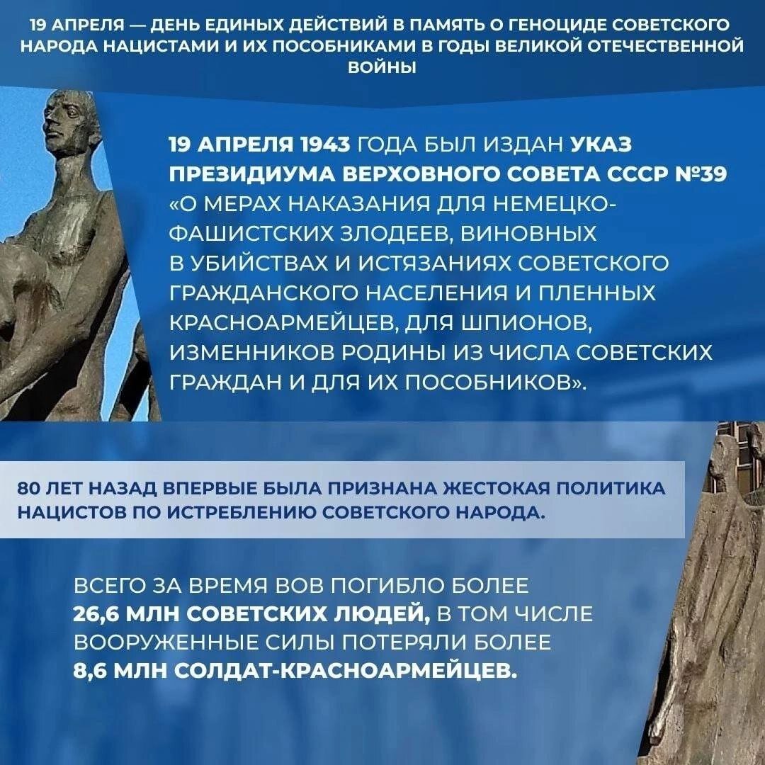 19 апреля установлен День единых действий в память о геноциде советского народа нацистами и их пособниками в годы Великой Отечественной войны. В эту дату принято вспоминать всех, кто погиб от ужасов кровавого нацистского режима, желающего уничтожить нашу Родину и каждого советского человека. Тогда нашим соотечественникам удалось отразить атаку и помешать планам Гитлера, фактически освободив весь мир вот фашистской заразы. Спустя 80 лет нацисты снова оказались у границы нашей страны и снова пытаются угрожать ее существованию. В попытках отменить русскую культуру киевский режим, ведомый коллективным Западом, зашел слишком далеко. И сегодня нашим соотечественникам приходится повторять великий подвиг своих дедов и прадедов, спасая Родину и весь мир от опасных идей нацисткой культуры. Геноцид советского народа фашистами не должен быть забыт! #БезСрокаДавности #РоссияПомнит #Нет фашизму