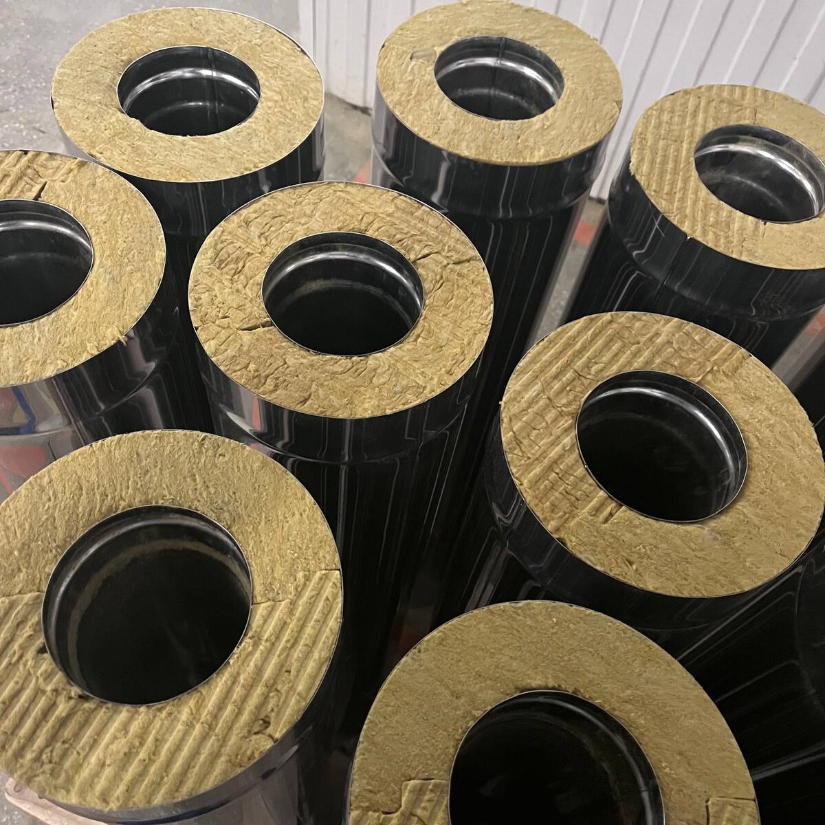 При производстве утепленных дымоходов мы используем базальтосодержащий утеплитель плотностью 110 кг/м3. Базальт - горная порода вулканического происхождения темного или черного цвета. Она образуется в виде базальтовых лав тонкозернистой иди стекловатой структуры с небольшими вздутостями, образовавшимися в ходе испарения газов или воды. Базальтовые волокна относятся к категории минеральных волокон, наряду с углеродными и стеклянными волокнами. Диаметр волокон варьируется от 9 до 13 мкм, что намного выше предела воздухопроницаемости (около 5 мкм). Базальтовые волокна являются прекрасными тепло- и звукоизоляторами, сохраняют свои механические свойства даже при высоких и экстремально низких температурах, очень устойчивы химически (как в кислых, так и в щелочных средах). Для производства базальтового волокна температура плавления породы должна быть выше, около полутора тысячи градусов Цельсия, для того чтобы гарантировать подходящую вязкость для изготовления пряжи. Для этого используется п