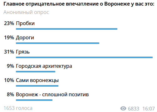 17 апреля редакция «Блокнот Воронеж» запустила опрос, призванный выявить в Воронеже такой аспект, который бросает наибольшую тень на город и оставляет самые неприятные впечатления. В итоге с ощутимым отрывом победил вариант «грязь», за который проголосовали 519 опрошенных или 31%.