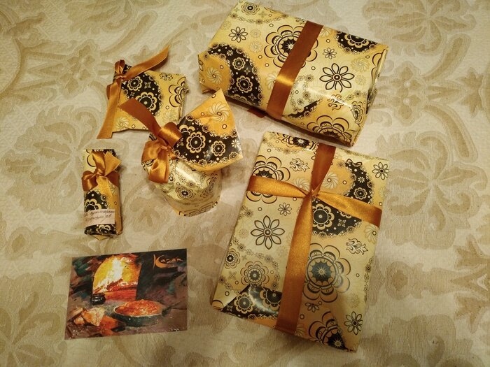 Вот и ко мне приехал мой желто-коричневый подарок. Именно такую цветовую палитру я указывала. Ну а простыня интересов у меня разнообразна, но основное было то, что если отправитель из другого региона, то буду рада подарку с местным колоритом или местному сувениру. На этом и сделала акцент моя Снегурочка Александра из Зеленодольска. Но сначала меня поразила упаковка! Какая красота! даже жалко было открывать. Конечно увидев откуда посылка, я ждала чак-чак, потому что он и местная сладость и подходит под цвет к тому же:) Зачем я только открыла посылку на ночь глядя, ведь было невозможно не попробовать эту вкуснотищу, а потом сложно оторваться:) это очень вкусно, а не то, что продают у нас, (размякшую сладкую булку). Во втором свертке была книга. Я указывала интерес к местной литературе, мифологии, сказкам и т.д. Вот теперь буду читать татарский народный эпос:) В третьем сверточке был чудесный брелок и магнитик. Далее я нашла 2 баночки, в одной конфетки, которые подойдут для выпечки, чем я