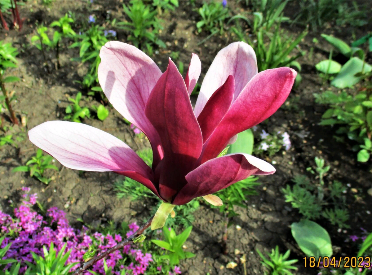 27.04.2017. МАГНОЛИЯ "СЬЮЗАН". Она начала цвести, когда была высотой всего см. 40. Другие магнолии зацветали такими же. После посадки они могут долго сидеть, укореняться, но хорошо укоренившись разные сорта растут по- разному.
