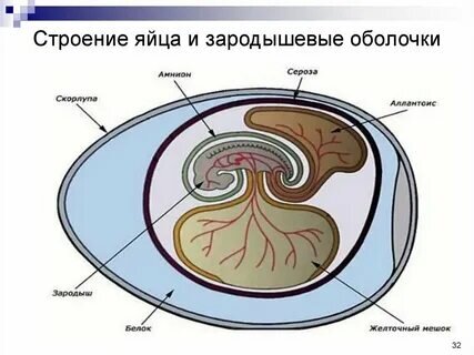 Желточный мешок связан с телом эмбриона желточным протоком, стенки которого образуют желточный стебелёк (желточную ножку), соединённым со средней частью кишечника (средней кишкой). В этом месте наполненная желтком полость желточного мешка сообщается с полостью кишок. По желточной ножке проходят желточные артерии и вены. Основная функция желточного мешка — абсорбция питательных веществ из желтка и перенос их к эмбриону. Это возможно благодаря тому, что внутренняя поверхность желточного мешка имеет складчатую структуру и выстлана железистым эпителием. Наружная его часть покрыта хорошо развитой сетью кровеносных сосудов, связанных с кровеносной системой эмбриона. Закончив рост по поверхности, желточный мешок продолжает расти и в глубь желтка, образуя ворсинчатые складки, что увеличивает его всасывающую поверхность. Максимальной массы желточный мешок достигает на 15-17-е сутки инкубации. Позднее его масса уменьшается. На ранних стадиях инкубации до 5-х суток и, частично, до 10-х желточный мешок выполняет также дыхательную функцию. В конце инкубации перед вылуплением цыплёнка желточный мешок вместе с желтком втягивается в брюшную полость и резорбируется (рассасывается) уже после вывода. Амнион — тонкий прозрачный пузырь, в котором лежит зародыш. Развивается он, как и другая оболочка — сероза, из верхних слоёв бластодермы. Как только сформировались мозговые пузыри и складка, отделяющая головной конец эмбриона от желтка, голова из-за большой массы начинает погружаться в желток. Она, как колпачком, закрывается складкой, растущей с бластодермы. Позднее, при погружении в желток и туловища, такие же складки охватывают эмбрион с боков и с хвостовой стороны. На 4-е сутки инкубации стороны складки срастаются над зародышем, одевая его двойным футляром. Из внутренней поверхности складки образуется амнион, из наружной — сероза. Только один небольшой участок складки остаётся несросшимся, он соединяет полость амниона с пространством, заполненным белком. Это сероамниотический проток, по которому в дальнейшем яичный белок будет проникать в амнион. Стенки амниона тонкие, прозрачные. В них нет сосудов, но есть мышечные волокна. Благодаря им амнион может пульсировать, сжимать и расширять свою полость. В начале инкубации амнион плотно облегает эмбрион. Потом, наполняясь жидкостью, он становится настолько просторным, что позволяет зародышу двигать ногами и головой. Во второй половине инкубации полость амниона становится более тесной. Амнион и амниотическая жидкость имеют большое значение в жизни эмбриона. Прежде всего, амниотическая жидкость — среда, окружающая зародыш. Эмбрион, состоящий в первые сутки из нежных, богатых водой тканей и, не имея ещё кожных покровов, погиб бы вне водной среды. В амниотической жидкости растворены минеральные соли, благодаря чему между ней и тканями зародыша создаётся нужное осмотическое давление. Амниотическая жидкость обладает и способностью убивать микроорганизмы. Амнион предохраняет зародыш от механических повреждений, которые были бы неизбежны из-за твёрдой скорлупы яйца. Благодаря пульсации амниона совершаются некоторые перемещения жидкости и зародыша. Во вторую половину инкубации вследствие давления, увеличивающего в теле зародыша и оболочках, белок через сероамниотический проток поступает