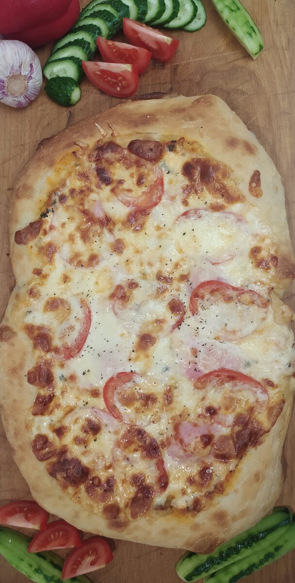 Пицца готовится просто и вкусно. Для начала приготовим опару для теста. Для этого необходимо смешать теплую воду, дрожжи (пивные или сухие), сахар, и муку. Даём постоять опаре 10-15 мин. Если дрожжи используете сухие то, время можно не выжидать. Просеять муку, постепенно добавить опару, соль, растительное масло. Замесить тесто. Тесто должно быть зернистым. Накрыть пищевой плёнкой. Дать постоять пол часа, после аккуратно перемещать тесто смазав руки растительным маслом снизу вверх и снова дать постоять под плёнкой пару часов, пока тесто не увеличится в несколько раз. Делим тесто на две части, придём форму, накрываем полотенцем и даём постоять ещё 15-30 мин. Выкладываем тесто на пергаментную бумагу, распределяем тесто не касаясь краёв. Перекладываем на решетку. Отправляем а духовку на 5 мин (режим вентиляции). Готовим соус: смешиваем томаты, сушенный базилик, оливковое масло. Смазываем пиццу, можно оставить только соус, но мы добавили ещё майонез, т.к. наши детки любят в таком