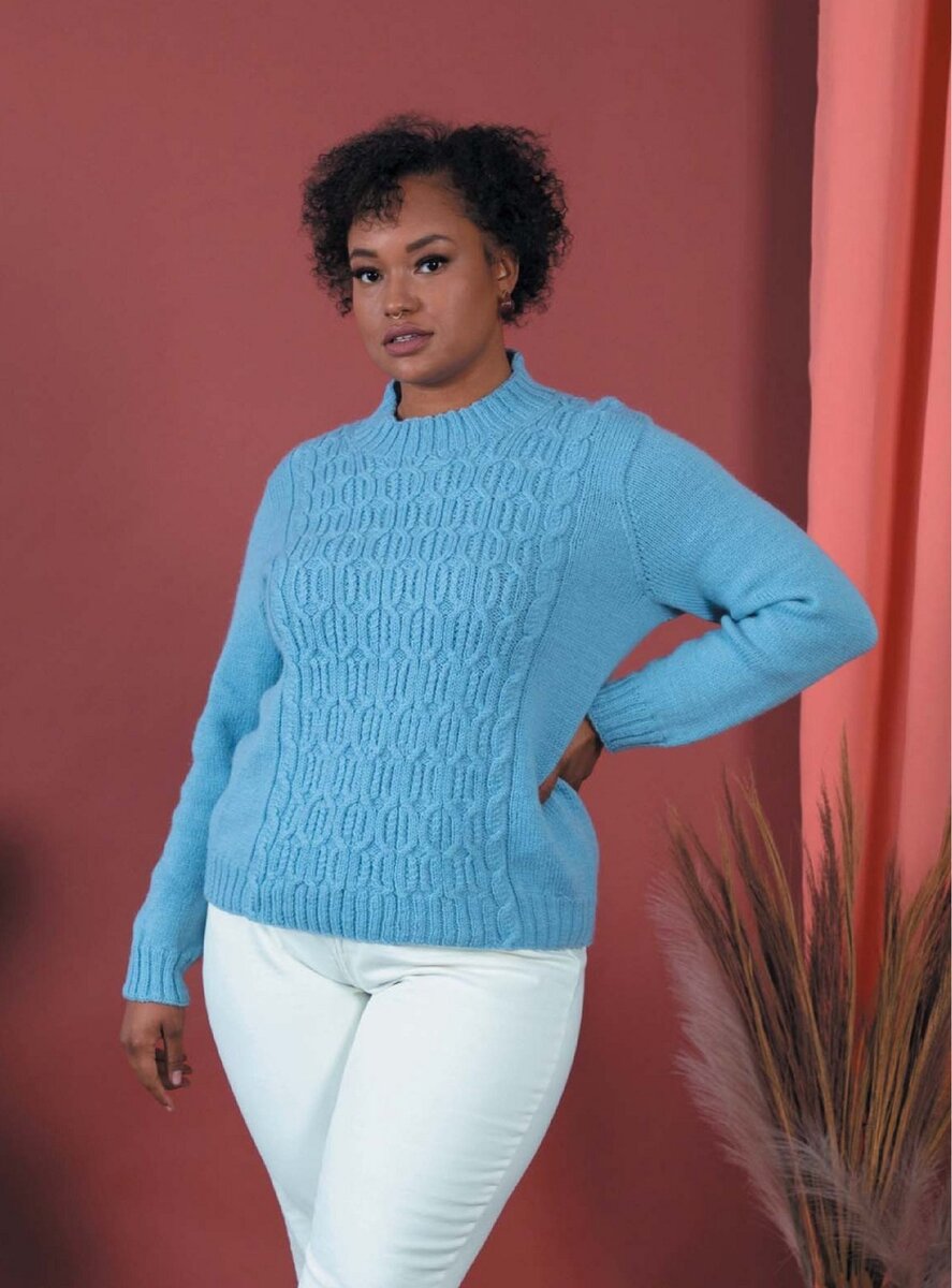 На фото модель в пуловере размером 44,5" со свободой облегания 6 см.