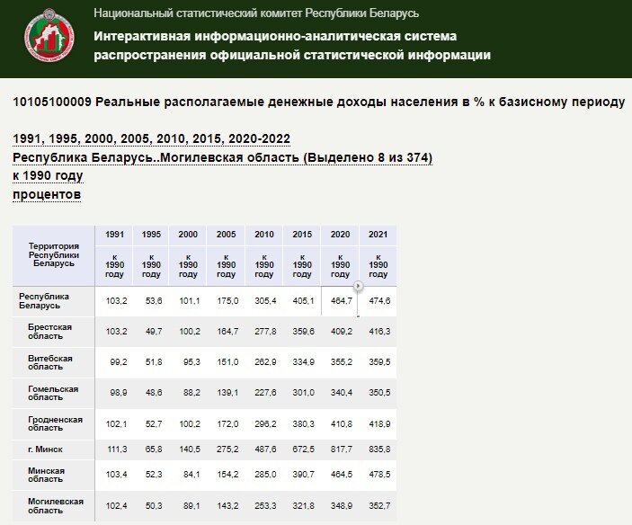 Я уже когда-то рассказывал про фантастические цифры роста реальных доходов, которые дает Белстат. Напомню, что по ним получается что в Беларуси реальные доходы населения якобы составили более чем 470% в 2021 г. по отношению к уровню 1991 г.