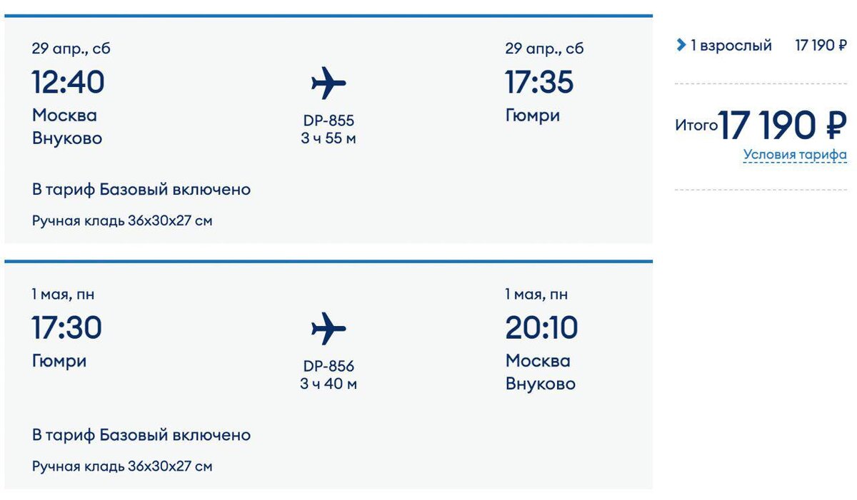 Самый дешевый заграничный перелёт на майские из Москвы — в армянский Гюмри. «Победа» продает билеты за 17000₽ на первые выходные и за 18000₽ на вторые. Можно полететь и с 29 апреля по 9 мая за те же деньги. Вам никто не запрещает. 🛫 Туда: 29 апреля, 12:40 → 17:35 🛬 Обратно: 1 мая, 17:30 → 20:10 🎟 Ссылка на билет: https://avs.io/2XE52 или 🛫 Туда: 6 мая, 12:40 → 17:35 🛬 Обратно: 9 мая, 13:05 → 15:45 🎟 Ссылка на билет: https://avs.io/2XE5q Время вылетов очень комфортные. Из Внуково. В базовый тариф «Победы» включена ручная кладь любого веса, но размером 36х30х27 см. Взять с собой багаж на 10 или 20 кг лучше на их сайте. Вообще лучше сконфигурировать билет там: ticket.pobeda.aero Виза не нужна, можно по внутреннему паспорту. Между Гюмри и Ереваном 2 часа на такси и 2-3 часа на электричках. Расписание посмотрети тут: www.railway.am/ru. Для такси используйте «Яндекс». Из Гюмри ближе Грузия, она прям вот, за горой. А из Еревана можно полететь дальше в Париж, Рим, Милан, Венецию или Дор