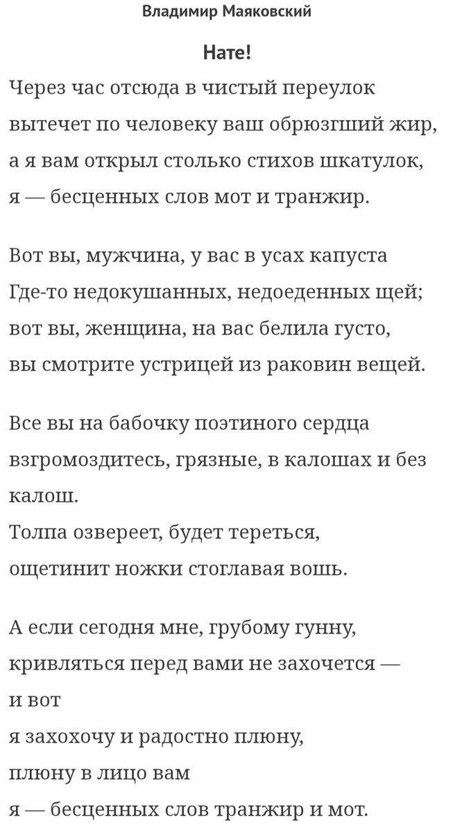 Нате!" 1913 •Жанр: сатира. •Направление: модернизм. •Течение: футуризм. •Темы: поэт и толпа, "разложение" общества, отличие пафоса. •Стихотворный размер: акцентный стих, присутствует множество рифмовок. Связано это с тем, что В.В. Маяковский не признавал какой-то конкретный вид, не ставил себя в рамки-ограничения. •Идея: мысль строится на антитезе: "бабочка поэтиного сердца" противопоставлена обрюзгшей толпе-воши. •История создания: В.В. Маяковский создал стихотворение в 1913 году. Поэту удалось впервые прочесть свой текст на открытии московского литературного кабаре "Розовый фонарь", куда он был приглашён. Стихотворение вызвало ярость и непонимание. •Анализ: Лирический герой Маяковского находится в остром конфликте с окружающим его обществом. Сталкивается чёткая натура творца с пошлой средой "сытых". Для поэта высшая ценность- творчество, он использует свои слова в качестве валюты, но среда, привыкшая к материальным благам, равнодушна к нему. Двойственность героя: с одной стороны