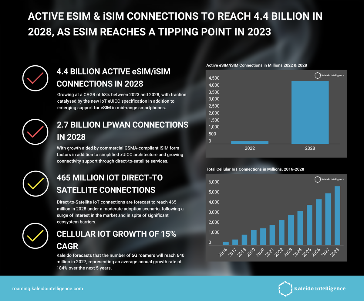 В 2028 году в мире будет насчитываться почти 4,5 млрд абонентов мобильной связи, подключенных через eSIM или iSIM, то есть, без использования физических SIM-карт. Среднегодовой прирост абонентских баз по этим подключениям составит 63%, прогнозирует аналитическое агентство Kaleido Intelligence. Из них 2,7 млрд будет приходиться на IoT-устройства, их количество будет расти на 15% ежегодно. Ключевых драйверов роста будет два. Во-первых, это появление поддержки электронных SIM-карт с загружаемыми профилями в массовых смартфонах средней ценовой категории – сейчас они присутствуют только во флагманских моделях буквально нескольких производителей. Во-вторых, это появление спецификации SGP.32, которая существенно упрощает внедрение eSIM и iSIM для IoT-устройств. Если в старой спецификации SGP.22, предназначенной для обычных абонентских устройств, была реализована только удалённая загрузка профилей (RPM), то новая включает большое количество функций, предназначенных именно для массового управле