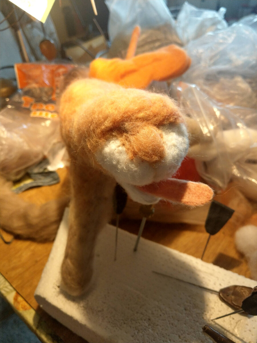"Схватка. Валяный медведь +"/продолжение/ По прошествии нескольких дней, порешав насущные , жизненные проблемы, связанные с оплатой ЖКХ, готовкой пищи, стиркой , уборкой , принялся завершать начатый проект. Вторым персонажем, моей композиции , как вы уже ,наверное догадались, стал тигр... Всегда интересно наблюдать самому, за своим ходом мысли в процессе творчества,превращением куска шерсти во что то задуманное тобой... Не имею привычки, как очень многие, публикующие в сетях свои изделия,изначально рисующие скетчи,чуть ли не картины, вплоть до самой скрупулёзной мелочи...- ну, видно им это так нужно.. Я. сразу приступаю без излишних временных затрат к действию, то, что хочу изобразить у меня в голове... как если бы это был кусок пластилина, и на него послойно, на каркас, наношу слои"мышц","шкуры" мимические мышцы"....Я. так привык...И, не зная как выйдет, чисто , по ходу пьесы, принимаю решения в изменении как позы персонажа, так и его мимики...тем более что каркас позволяет,