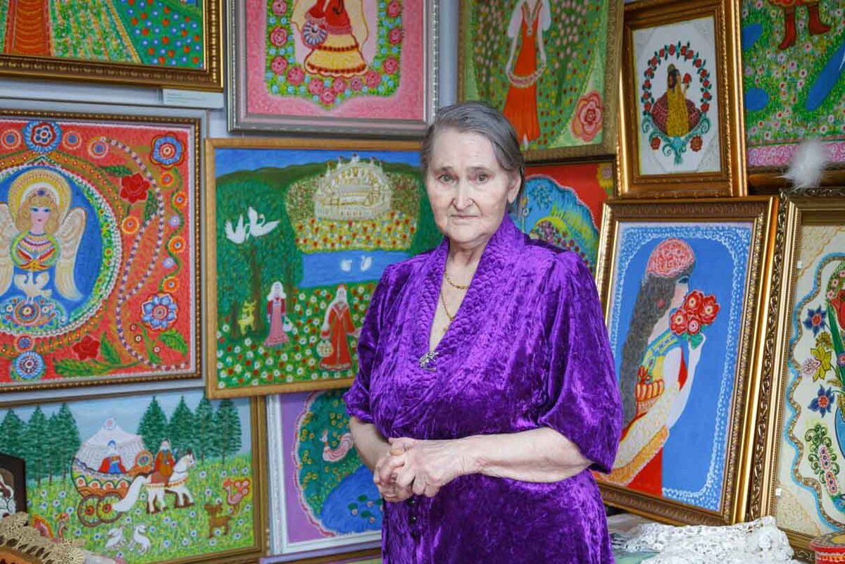 Александра Николаевна Попова – казачка, фельдшер, красавица (язык не повернется назвать ее старушкой!) и хозяйка волшебного жилища. Снаружи – это многоквартирный дом в Переславле-Залесском, в Лесном переулке, а переступаешь порог ее квартиры – оказываешься в самом настоящем волшебном лесу, в сказке. Без преувеличений! Со стен смотрят нарядные царицы и принцы, и жар-птицы гордятся великолепными оперениями, и ангелов так много… А вот мама с дочкой с корзиночками через лужок идут, цветы вокруг – и две елочки. Зайки какие милые – ушки в стороны! А вот казак на коне… И внезапно – Кармен в профиль, я узнала ее по картонной коробочке с пудрой – в детстве такую у соседки видела на трюмо. Почему Кармен? А потому что красивая!