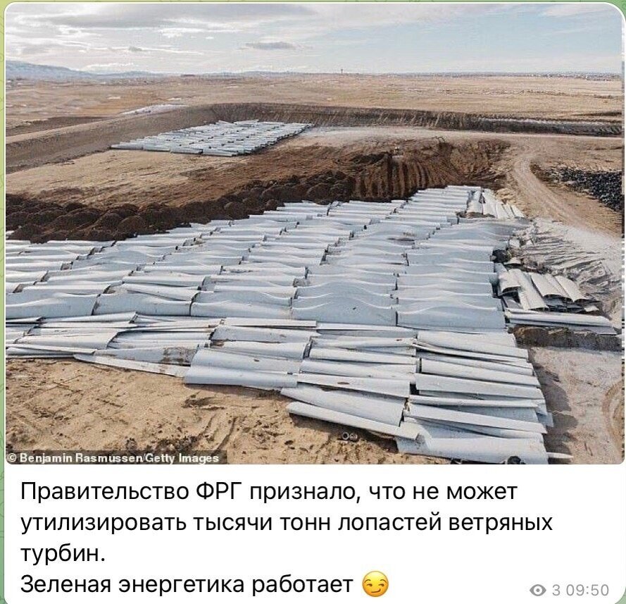 Зелёная энергетика называется так, потому что не загрязняет природу. Зелёная энергетика называется так, потому что не вредит живому. Зелёная энергетика называется так, потому что не дымит и не выбрасывает углекислый газ в атмосферу. Хотя подождите ка... А что это за проблема с утилизацией? Да быть такого не может! Ой, всё... В Европе в год демонтируется порядка 3800 лопастей ветрогенераторов, отслуживших свой срок. В америке эта цифра ещё больше - 8 000. А технологии утилизации нет. И если она не появится, то к 2050 году в мире накопится 40 миллионов тонн отслуживших лопастей ветрогенераторов. Сейчас их просто закапывают в землю. Лопасти состоят из композитных материалов, которые не разлагаются и не отравляют окружающую среду, потому прямого вреда природе от них нет. Но при их захоронении разрушают естественную природную среду. Для установки ветряков вырубаются леса, и для захоронения лопастей от них тоже уничтожается живая природа. Но при этом технология очень зелёная. Не скажу, что
