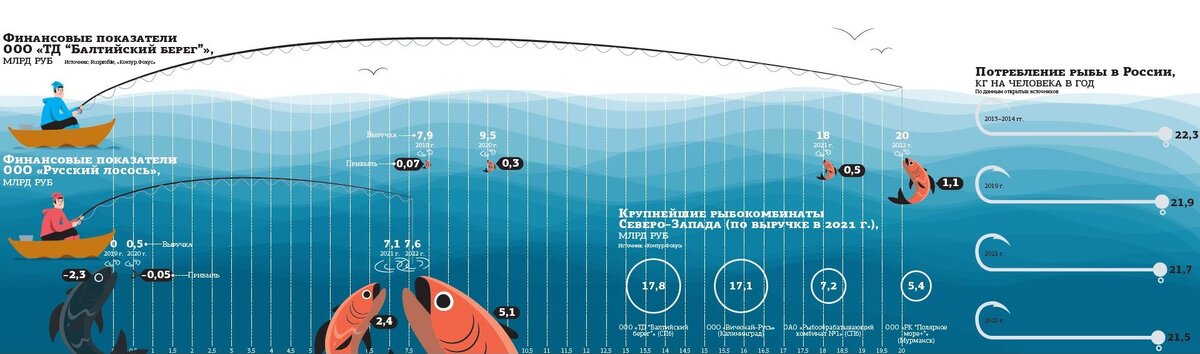 В дальнейшем рыбный бизнес, хотя и был непрофильным активом Сбербанка, стал набирать обороты. Так, выручка ООО "ТД “Балтийский берег”" выросла с 9,5 млрд рублей в 2020 году до 20,4 млрд в 2022–м. Чистая прибыль за этот же период увеличилась с 276 млн до 1,1 млрд рублей, говорится в данных СПАРК.