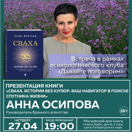 ВСТРЕЧА В РАМКАХ ПСИХОЛОГИЧЕСКОГО КЛУБА «ДАВАЙТЕ ПОГОВОРИМ». 27 апреля в 19:00 в Московском доме книги на Новом Арбате состоится презентация книги Анны Осиповой «Сваха. Истории без купюр. Ваш навигатор в поиске спутника жизни» Анна Осипова - руководитель брачного агентства. В своей работе Анна помогает людям понять главное: в отношениях важны любовь, доверие, уважение, взаимопонимание, поддержка и общее мировоззрение. На встрече в Московском доме книги автор представит свою книгу «Сваха. Истории без купюр. Ваш навигатор в поиске спутника жизни». На презентации Анна Осипова ответит на ваши вопросы и расскажет о своей работе, о трудностях поиска партнера через сваху, даст конструктивные рекомендации, которые помогут вам в самостоятельном поиске спутника жизни и создании счастливого союза, основанного на любви и семейных ценностях. Ждем вас! Московский дом книги на Новом Арбате, 2-й этаж, сцена Литературного кафе. Ваша Анна Осипова.