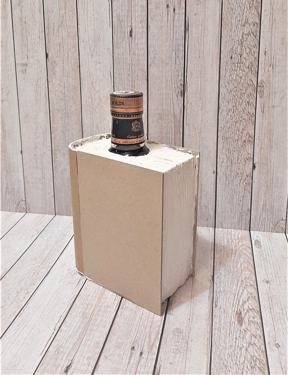Приветствую всех, кому интересно моё рукоделие))). Бутылок-книг я делаю немало, их частенько заказывают в подарок по разным поводам, на праздники, встречи и т.д. Декорировать их можно по-разному, в зависимости от пожеланий заказчика, предпочтений и вкусов одаряемого, тематики самого повода, наконец. Но в центре всей работы лежит именно форма - книга, в которую бутылка прячется. Поэтому я решила вынести отдельной статьей рассказ об основных моментах создания основы для будущего декора. Прежде всего, для работы нужны бутылочки определенной формы - как можно более плоские, например: Очищаем поверхность от этикеток и обезжириваем: Далее, обычными салфетками с помощью клея ПВА оклеиваем всю поверхность, оставляя чистым горлышко: Этот момент важен, поскольку салфетки выступают в качестве грунта и помогают лучше скрепить материалы в дальнейшем. Приступаем к разметке деталей книги - корешка и переплетных крышек. Отмеряем нужного размера картонные детали: Крышки я делаю из переплетного карто