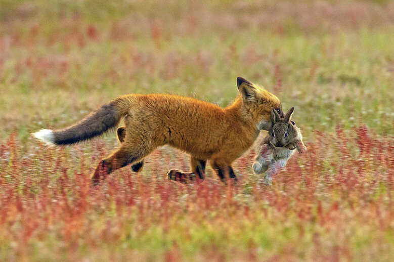 Прокормить себя в дикой природе непросто: надо не только выследить и поймать добычу, но еще и в сохранности донести до своего логова. За удачливым охотником сразу же начинают следить десятки других глаз других обитателей, которые не против полакомиться свежепойманной добычей, не утруждая себя долгой охотой. Свидетелем подобной сцены стал фотограф Кевин Эби. Он наблюдал за жизнью степных лис в полях острова Сан-Хуан, который расположен в государственном заповеднике неподалеку от Вашингтон. Внимание Кевина привлекла молодая особь, которая ловко поймала прятавшегося среди травы кролика и, взяв его тушку в пасть, поспешила уединиться со своей едой. Но не тут-то было: неожиданного сверху раздался клекот птицы, и огромный белоголовый орлан камнем упал на лису и ее добычу. Несколько секунд борьбы и огромная птицы взмывает вверх, держа в когтях кролика. Но и лиса не собиралась сдаваться, крепко держа в зубах свою добычу. Орел поднимался все выше и выше, поэтому хищнице пришлось разжать челюст