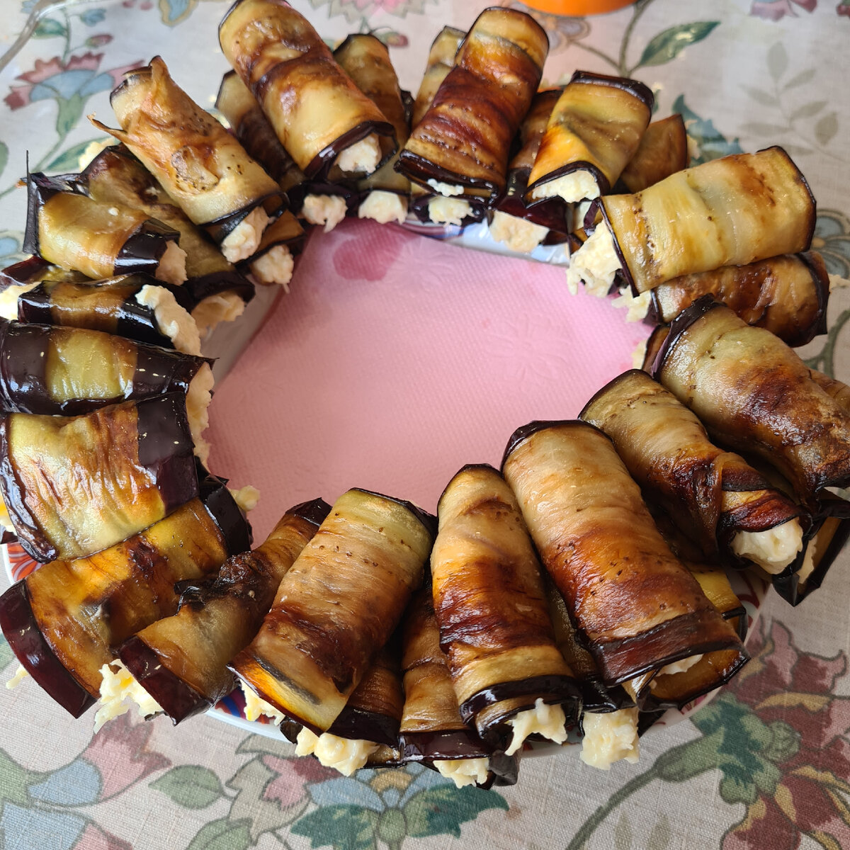Это очень вкусная закуска, делаем её не так часто, потому что процесс немного длительный. Но когда делаем гости говорят "Почему так мало?" И длительный процесс приготовления того стоит. Когда делаю на праздник, чаще всего готовлю их с вечера. Для начала берём баклажаны 2-3 штучки. Режем вдоль, тоненько. Стараемся делать это аккуратно и ровно. Заливаем баклажаны холодной водой, немного подсаливаем. На 2-3 баклажана примерно 1 чайную ложки соли. Воды льём столько, чтобы полностью покрыть баклажаны. Сверху накрываем тарелкой, чтобы баклажаны не всплывали и для этого же ставим какой-нибудь груз. Оставляем минут на 30. После хорошо сливаем воду. На сковороде разогреваем растительное масло и жарим баклажаны с двух сторон до золотистости. По мере необходимости масло подливаем. Выкладываем баклажаны на тарелку, застеленную либо салфеткой, либо бумажным полотенцем, чтобы лишний жир впитался в них. Теперь готовим начинку. На мелкой тёрке натираем сыр. Тут вес точный не скажу, так как зависит