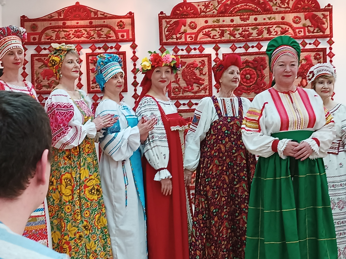 У нас в Электростали в музейно-выставочном центре им. О. А. Коняшина проходит областная выставка-конкурс «Лоскутная радуга Подмосковья». В рамках этой выставки мы вчера посетили шикарнейшее мероприятие - показ коллекций одежды «Калейдоскоп идей» и «Русский альбом» дизайнера Веры Костраменковой с участием агентства «Модели без границ» Дизайнер работает в простом подмосковном доме культуры Одинцовского района Московской области. В поддержку проекта был проведен и концерт, выступал ансамбль "Сувенир" этого же ДК. Про выступление ансамбля я уже писала вчера: Поет в ансамбле и сама Вера Павловна. Вот она, впереди в зеленом сарафане: Все костюмы и ансамбля, и двух показов так же смоделированы и сшиты этой талантливой женщиной. Вначале нам показали коллекцию «Русский альбом», это наряды, выполненные в русском народном стиле и подходят они, конечно, для выступлений и тематических мероприятий. Модели интересные, собравшие в себе традиции и стиль русской культуры и русского быта. Я в своем жур