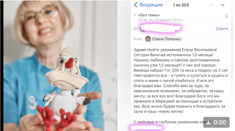 «Здравствуйте уважаемая Елена Васильевна! Сегодня Ванечке исполнилось 1,5 месяца! Нашему любимому и самому долгожданному сыночку уже 1,5 месяца!!! У нас всё хорошо. Ванюша набрал 1 кг 200 гр веса и подрос на 2 см! Нам нравится все - и гулять и купаться и кушать и спать и маме с папой улыбаться. И все это благодаря вам. Спасибо вам за чудо, за невозможное возможно, за небывалое, за нашу мечту, за все все все! Благодарю Бога что мы приехали в Меркурий за помощью и встретили вас. Всю жизнь будем помнить и благодарить за сына и нашу новую жизнь!
