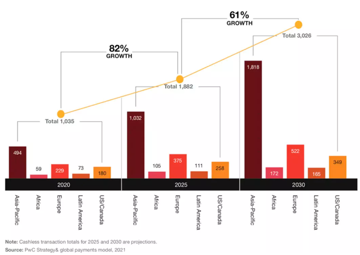 Ожидается, что к 2030 году в Канаде покупки за наличные составят лишь 10%, согласно Moneris. По данным исследования PwC, во всем мире объемы безналичных платежей увеличатся более чем на 80% с 2020 по 2025 год и почти утроятся к 2030 году.