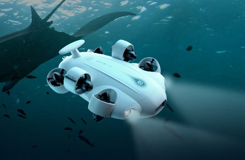 Компания Qysea представила один из последних и наиболее оснащенных подводных дронов — Fifish V-EVO. Действия подводного дрона V-EVO контролируется оператором на поверхности с помощью кабеля связи. Используя портативный контроллер, подключенный к тросу, пользователь передает команды дрону, просматривая видео в реальном времени с помощью камер, используя специальное приложение на смартфоне. Длина троса составляет 100 метров, также это максимальная глубина погружения дрона. Он оснащен камерой с широкоугольным объективом с углом обзора 166 градусов. Максимальное разрешение составляет 4K/60 кадров в секунду. В глубоких темных водах камере помогают два направленных вперед светодиодных прожектора мощностью 5 000 люмен. Программное обеспечение для улучшения изображения на основе искусственного интеллекта также помогает получать изображения высокого качества и отфильтровывать планктон и другие взвешенные частицы. Отснятый материал записывается на встроенную карту памяти объемом 64 Гб. К порту н