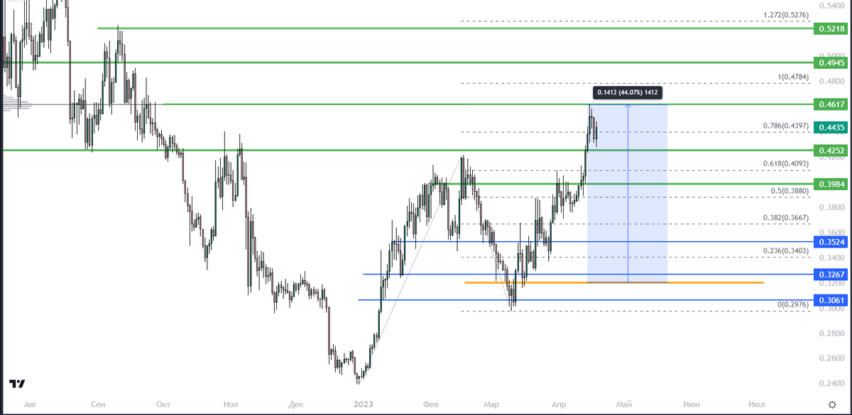 За месяц цена Cardano(ADA) выросла на 55%, мы забрали 44% роста. Разбираем,как получить хорошую точку входа в сделку по коррекции Фибоначчи