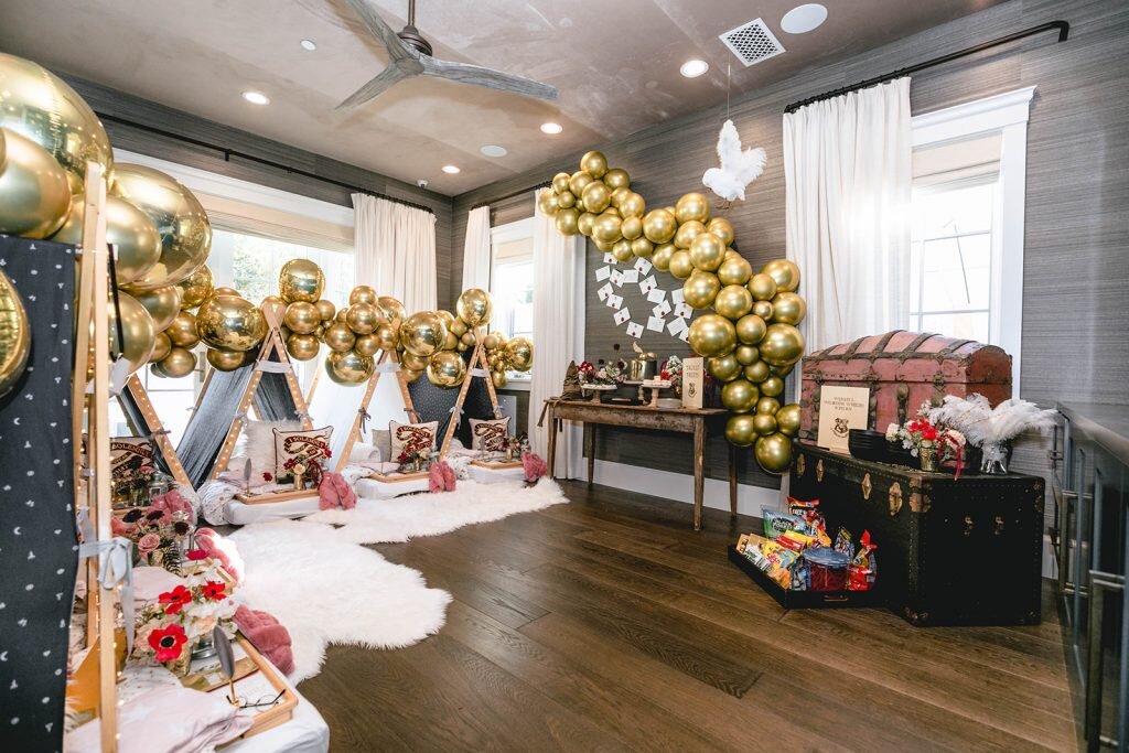 У нас новый праздник для поклонников Гарри Поттера! На этот раз в формате дня рождения с ночёвкой. Праздник начался днём с обеда в кухне. Здесь девочек ждал пышно оформленный стол, а на каждой тарелочке лежал крылатый ключик из Философского камня, с красивой именной биркой, украшенной восковой печатью. Первый символ волшебства, который сразу настроил всех на особенный день! А на чердаке девочек ждали маленькие палатки-типи с чудесными подарками. А их было очень много, настоящее Рождество в Хогвартсе с кучей магических даров 🙂 В типи положили мягкие матрасы, чтобы все хорошо выспались, несколько подушек, в том числе декоративная в стиле Поттера. В подарок гостьи получили волшебные пижамы, пушистые тапочки, круглые очки и волшебную палочку в красивой коробочке! На матрасах стояли подносы с букетами, пером для письма и масочками для лица. Всё, что нужно для пижамной вечеринки девчонок! А стену даже украсили чудесным тканным гобеленом с картой Хогвартса. Наверху тоже сделали зону с едой,