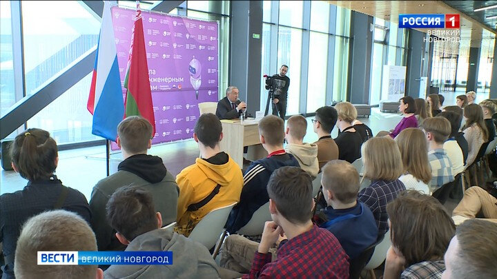 В беседе приняли участие более ста человек: это новгородские студенты и гости из республики Беларусь, слушатели школы по инженерным наукам Союзного государства, которая в эти дни работает в Великом Новгороде.