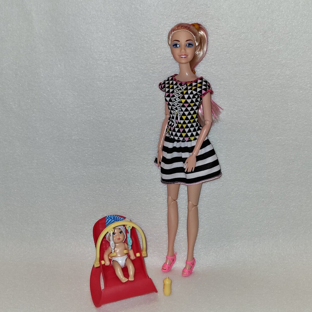 Кукла-мама шарнирная, качество вполне себе для китайской куклы, не хлюпенькая. Насчёт прошивки не знаю — волосы не распускала. Малыш, возможно, аналог Крисси от Mattel, но он ростом побольше. У него неповоротная голова. Мне достался «экземпляр» с полустёртыми губами:). Шапочка была прикл