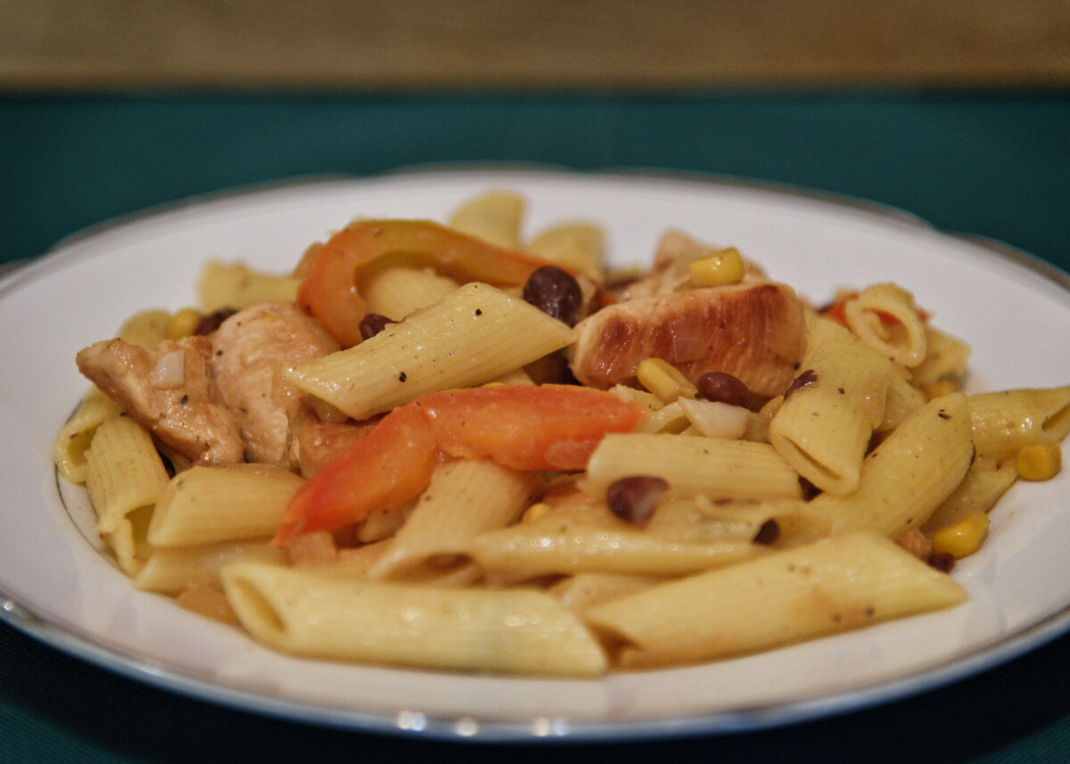 Паста с куриной грудкой, красной фасолью и кукурузой