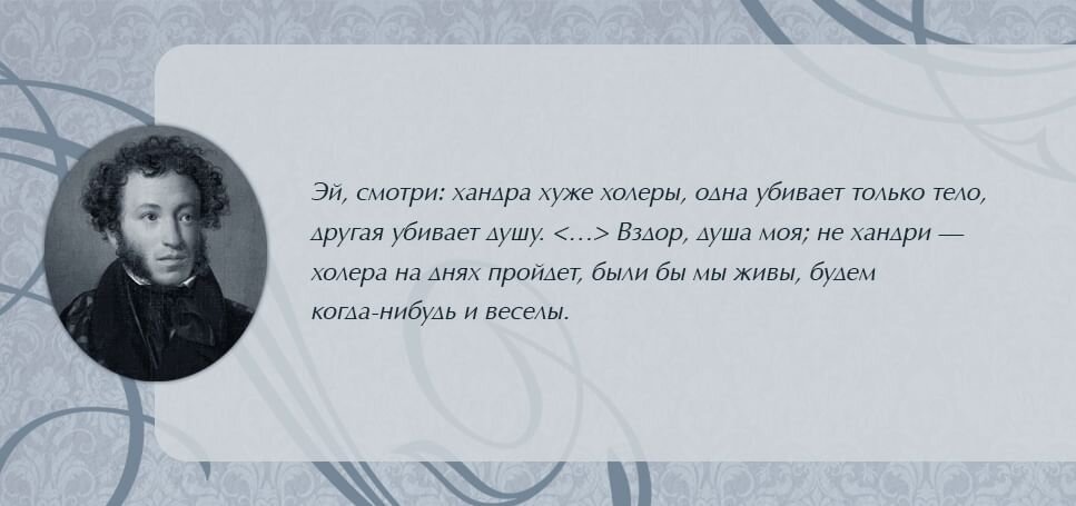 Однако, помня о том, что «хандра хуже холеры», поэт начал писать — и болдинский «карантин» обогатил русскую литературу целыми 40 произведениями. Своему другу, критику и поэту Петру Плетневу, Пушкин писал: