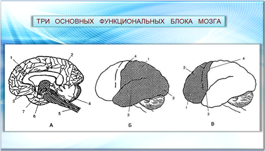 Перед тем, как говорить о таких нарушениях, как дислексия, дисграфия и дискалькулия, я бы хотела немного разобрать то, как устроена функциональная часть мозга. Мы знаем, что психические процессы человека протекают при совместной работе сразу нескольких мозговых отделов. Опираясь на эту информацию и на работы нейропсихолога Лурия, мозг можно разделить на три функциональные части: - блок, регулирующий тонус и бодрствование (уровень активности мозга) ) - блок, отвечающий за получение, переработку и хранение информации - блок программирования, регуляции и контроля психической деятельности Каждый из этих блоков имеет очень сложное строение и состоит из трех типов (как минимум) корковых зон, расположенных друг над другом: · Первичных (проекционных) – в них поступают импульсы с периферии и наоборот ( от них импульсы идут на периферию) · Вторичных (проекционно-ассоциативных) – перерабатывают полученную информацию · Третичных (зон перекрытия) – обеспечивают сложные формы психической деяте