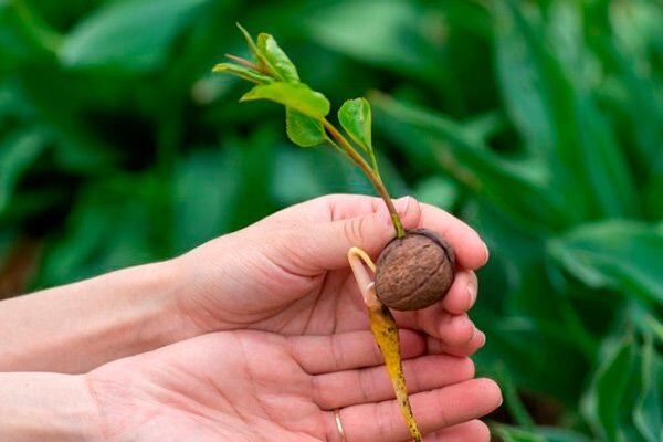 - Далее поместите пророщенный орех в контейнер и установите на солнечный участок для продолжения выращивания саженцев.