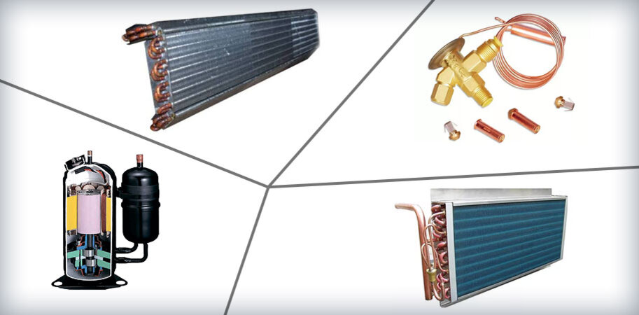 В составе холодильного контура кондиционера, независимо от его мощности, назначения или принципа работы, обязательно присутствуют четыре основных элемента: компрессор, конденсатор, дросселирующее устройство и испаритель. В дополнение к этим элементам могут использоваться и другие, способствующие автоматизации, эффективности и безопасности работы кондиционера, но они считаются второстепенными. Любая неисправность в работе одного из основных элементов оборудования может привести к отказу всего кондиционера.