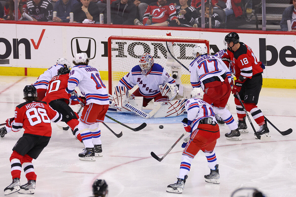 Приветствую Вас дорогие друзья на моем канале, посвящённому лучшей хоккейной лиге мира. Накануне состоялись четыре матча в первом раунде в одном из которых определился фаворит, а в трех других ситуация запутана и предсказать кто выйдет в них победителями невозможно. Начну обзор с матча, в котором Нью Джерси принимал Рейнджерс. В первом матче "Дьяволы" потерпели разгромное поражение со счётом 1:5 и вчера им победа была необходима как воздух. В стартовом периоде небольшим преимуществом владели гости, но пробить Витека Ванечека им не удалось. Зато Дэвилз на 12 - й минуте усилиями Эрика Хаулы реализовали большинство и вышлтюи вперёд - 1:0. Во второй двадцатиминутке Рейнджерс перевернул игру. На 26 - й минуте Владимир Тарасенко сравнял счёт, а затем Крис Крайдер дважды реализовал численное преимущество. На второй перерыв гости ушли уже ведя в счёте - 3:1. На 46 - минуте Патрик Кейн добил "Дьяволов", отправив в ворота Ванечка четвертую шайбу. Через семь минут Каапо Какко установил окончат