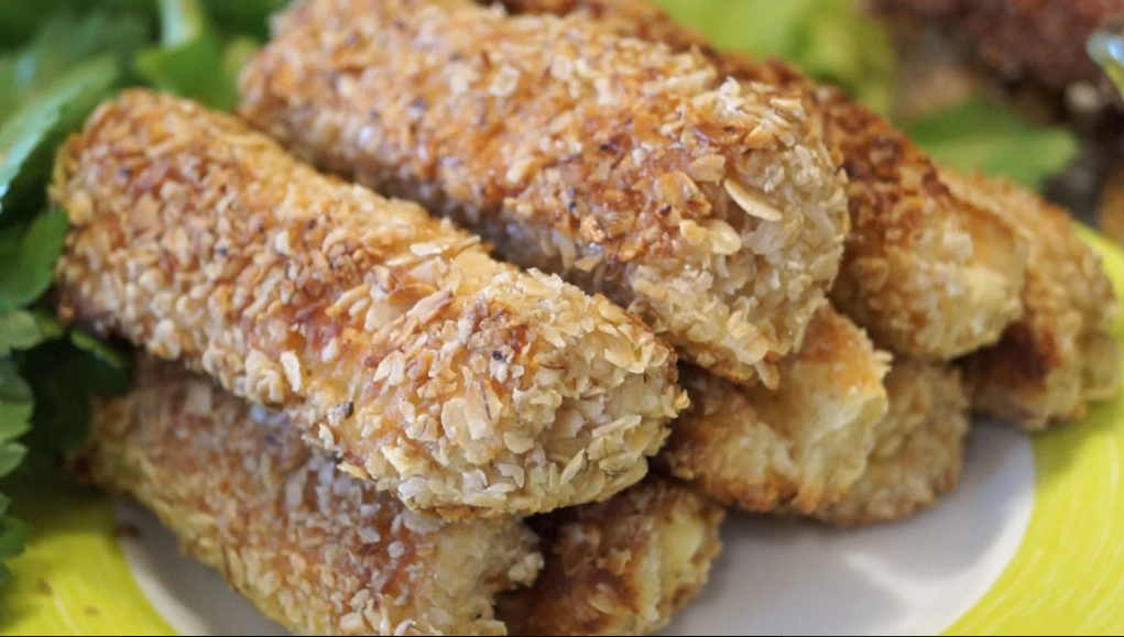 Каждый рулетик опускаем в яйцо, затем в хлопья