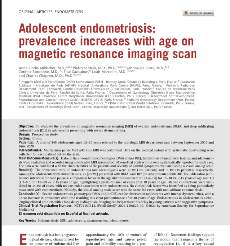 Эндометриоз выявляют примерно у 6-10% женщин репродуктивного возраста. Эндометриоз является причиной тазовых болей и бесплодия, что снижает качество жизни женщины. Многочисленные исследования подтверждают теорию Сэмпсона о регургитации менструальной крови, которая является ключевой в патогенезе эндометриоза, объясняя почему заболевание может начаться в подростковом возрасте при менструации. Негативное влияние эндометриоза на пациенток было бы меньше, если бы диагностика и лечение были своевременными и эффективными. Однако эндометриоз часто остается незамеченным, а время до постановки диагноза варьируется от 4 до 11 лет, при этом у 65% женщин изначально диагноз ставится неправильно. Эта задержка может быть в 3 раза больше у женщин, у которых симптомы появились в подростковом возрасте. Поэтому во Франции было проведено проспективное исследование. В период с сентября 2019 г. по июнь 2020 г. в отделение рентгенологического отделения МРТ было направлено 345 подростков в возрасте 12–20