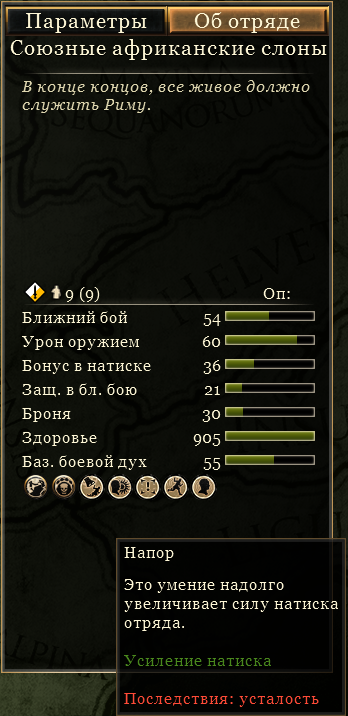 Ответный удар – отряд с данным свойством наносит дополнительный урон, когда отбрасывает врага. И снова только слоны обладают этим навыком.