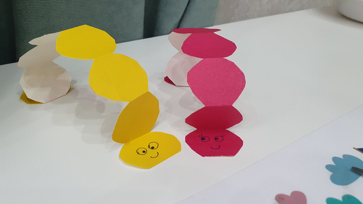 Увлечь чем-то мою двухлетнюю дочь сложно, поэтому я постоянно в поисках простых идей, которые займут её хоть на какое-то время. И если она залипает на 10 минут, значит я победила. Расскажу про легкую игру, которая нравится многим детям. Но, как оказалось, не моей 😄 Вырезаем две полоски бумаги. По инструкции 4,5*13 см, но у меня нет линейки и времени её искать, так что все делаю на глаз, и так тоже работает, проверено. Складываем полосочку в одном направлении равными частями. В согнутом виде округляем углы ножницами. Потом разворачиваем и крайние два сектора загибаем в другую сторону. Гусеница почти готова! Рисуем глазки. Берём трубочку, отрезаем у неё гнущуюся часть, чтобы удобнее было дуть. Ставим гусеницу в лесу задом и тихонько дуем. Гусеница начинает ползти. Соседским детишкам очень понравилась эта забава, и соседки хвалятся, что потеряли детей надолго. Ксюше же хватило на две минуты. Все потому что мама не успела убрать ножницы, и понеслось... Гусеницы на части, трубочки