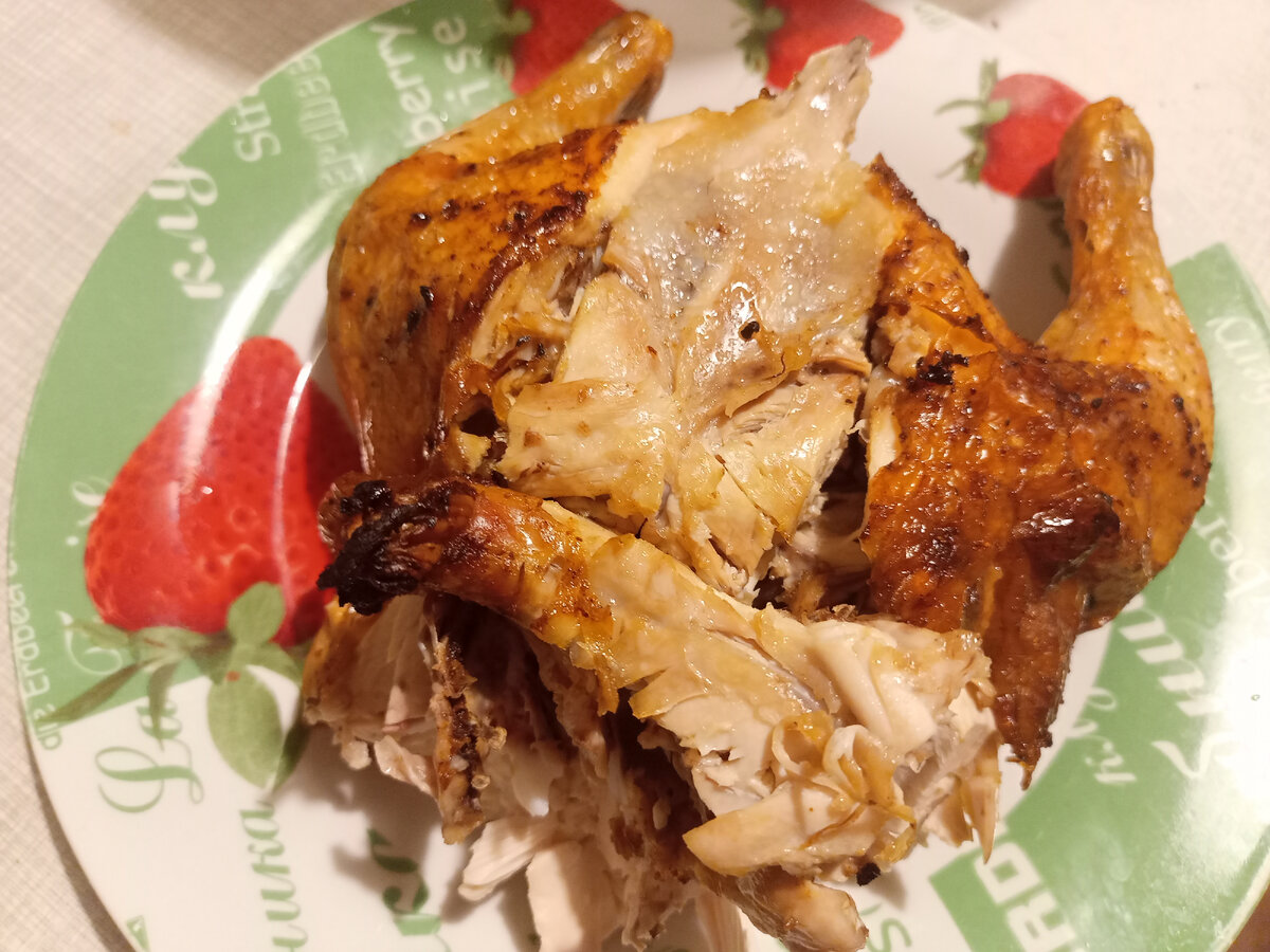 Выкладываем курицу на тарелку. Подаётся она в неразрезанном виде. Этот вариант подходит прекрасно для одного или двух человек. Вы просто начинаете отламывать и отщипывать от курицы всё руками. Делаем это с энтузиазмом, так вкуснее. Если делать утончённо, то не так и интересно уже.