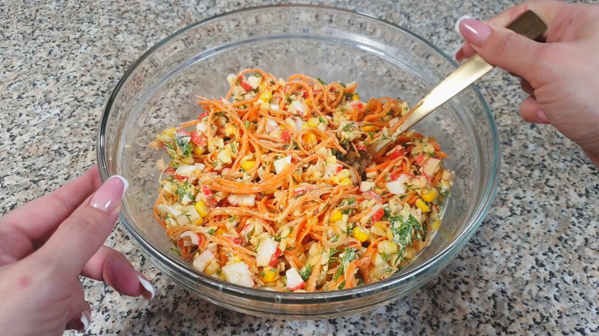 Как готовить: Берем пачку крабовых палочек весом 200 граммов и нарезаем на мелкие кубики. Берем несколько вареных яичек и также нарезаем на мелкие кубики. Перекладываем палочки и яйца в миску. Твердый или полутвердый сыр натираем на мелкой терке. И отправляем в салатницу. Открываем баночку сладкой кукурузы и сливаем жидкость. И остроту этому салату придаст морковка по-корейски. Добавляем 150 граммов морковки. Заправляем салат нарезанной зеленью укропа, майонезом. Соль и перец добавляем по вкусу. Все ингредиенты перемешиваем и подаем на завтрак, обед или ужин. Приятного аппетита! Рецепт: - 200 г крабовых палочек