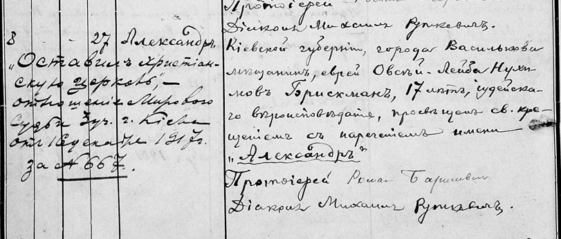 Всем здравствуйте Еще одна короткая заметка-находка. Киев Софиевский собор. 27 января 1900 года происходит крещение еврея: Киевской губернии, города Василькова мещанин. Еврей Овсей-Лейба Нухимов Брискман, 17 лет, иудейского вероисповедания, просвещен святым крещением с наречением имени Александр». Казалось бы – да таких случаев полно, что тут необычного? А вот – Отношением Мирового суда города Киева от 16 декабря 1917 года за № 667 данный Александр «Оставил христианскую церковь». И даже собственноручное заявление приложено: Господину мировому судье 3 уч.Киева Рядового 2 Калишского пограничного полка Васильковского мещанина Александра Петровича Брискмана (Киев, Межигорская № 45) Заявление 27 января 1900 ода я принял православие в Киево-Софийском Кафедральном соборе. В настоящее время заявляю о своем желании оставить христианскую церковь, прошу выдать мне об этом соответствующее удостоверение и одновременно сообщить причту Киево-Софийского Кафедрального собора. И вот мне интересно - он б