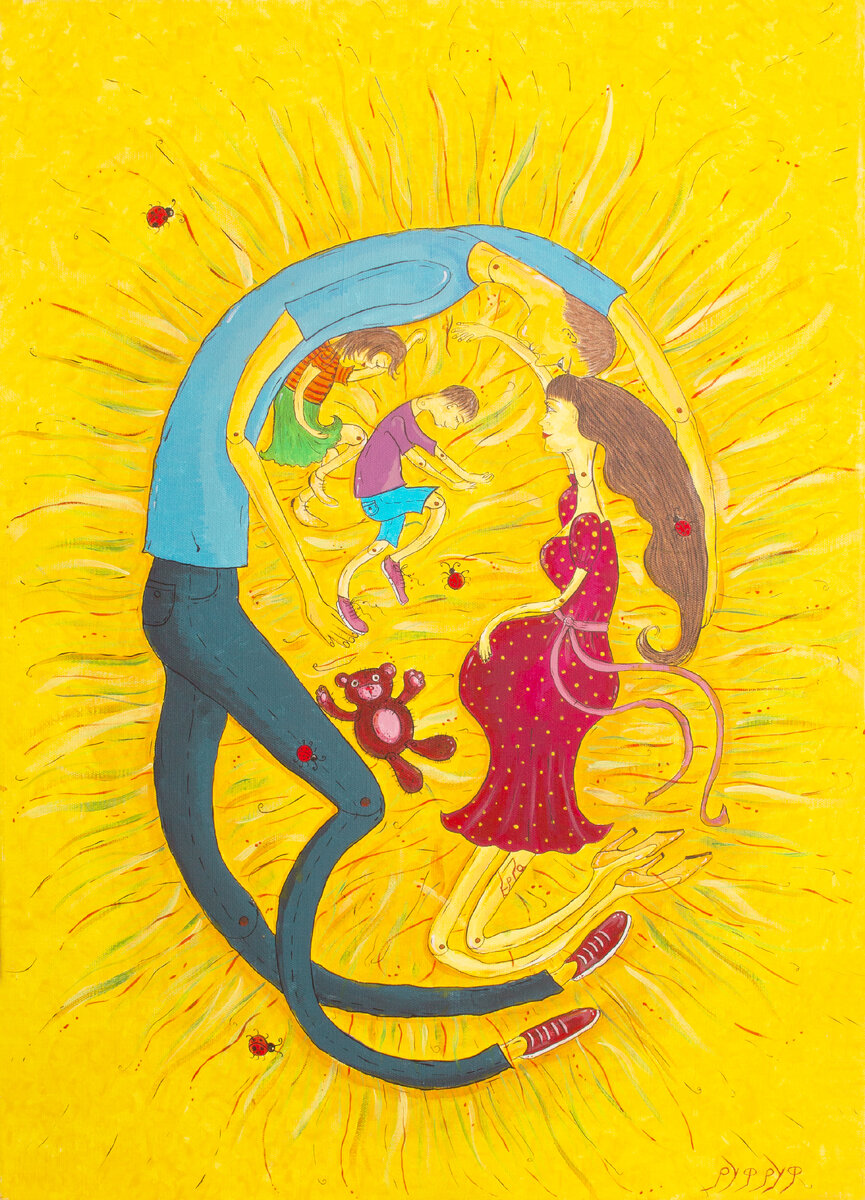 РУФ РУФ АРТ Картина «Укрывающий» - символ заботы о семье. Умение проявлять эмоциональное и физическое присутствие. Любимый, родитель, защитник, оберегающий семью – супруг. На картине изображена семья, дети мирно спят, в траве и лучах солнца. Они спокойны и уверены в будущем. Мужчина обволакивает, укрывает огромными руками, защищает семью от всего мира. Посвещается моему любимому супругу Владимиру Д. Love тебя Картина выбрана для выставки «КОСМОС» https://vk.com/artsouth2017 Спасибо большущее организаторам выставки Пертру и Кристине Присоеденяйтесь к творческому пространству РУФ РУФ АРТ https://vk.com/rufrufart для услады глаз и клеточек души Вы можете приобрести репродукции картин от 9 250 руб. есть все размеры, изготовление 5 - 7 дней. Картина является идеальным выбором для тех, кто ищет высококачественное, красивое и долговечное украшение для своего дома или офиса. • Для печати на холсте используется широкоформатный принтер и специальные пигментные чернила на водной основе. Это гара