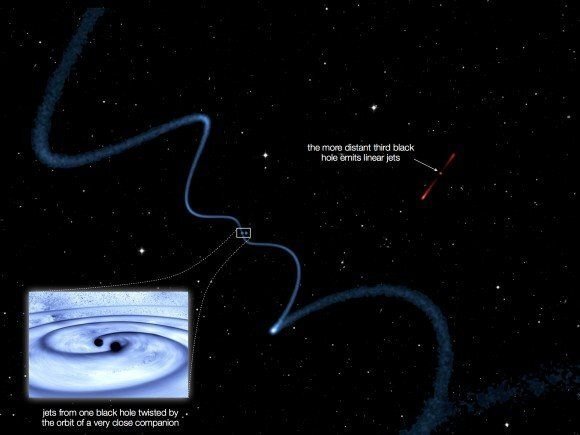В галактике, удаленной на четыре миллиарда световых лет, была обнаружена тесная система из трех вращающихся вокруг черных дыр — самая компактная из всех известных на сегодняшний день. Это может означать, что такие договоренности более распространены, чем считалось ранее.