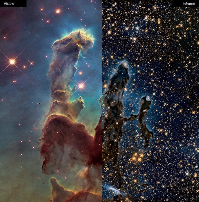 Туманность «Столпы творения» — визуально и в инфракрасном диапазоне