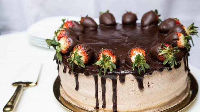 Ингредиенты: Бисквит: 10 яиц 200 гр. сахара 1 пакет ванильного сахара 200 гр. муки 6 столовых ложек какао Дополнительно: 1 стакан клубничного джема 2 стакана сливок 33%, очень холодных 1/4 стакана какао порошка 120 гр. сахарной пудры 2 стакана нарезанной клубники Шоколадный ганаш: 200 гр. черного шоколада 200 мл. сливок 33% 1 столовая ложка сливочного масла Клубника в шоколаде: 14 шт. Свежей Клубники 100 гр. шоколада Приготовить бисквит: Разогреть духовку до 180 градусов. Взбить яйца с сахаром, пока смесь не увеличиться три раза в объеме. Просеять муку и какао. С помощью шпателя, в три приема, добавить мучную смесь, аккуратно перемешивая в тесто, чтобы сохранить его воздушность. Разделить тесто на 2 равные части. Выпекать в течение 30 минут, проверить на готовность с помощью деревянной палочки. Если пирог готов, тесто не должно прилипать к зубочистке. Готовые коржи остудить полностью, а затем разрезать на две половины. Подготовить клубничный джем (слегка разогреть) чтобы смазать