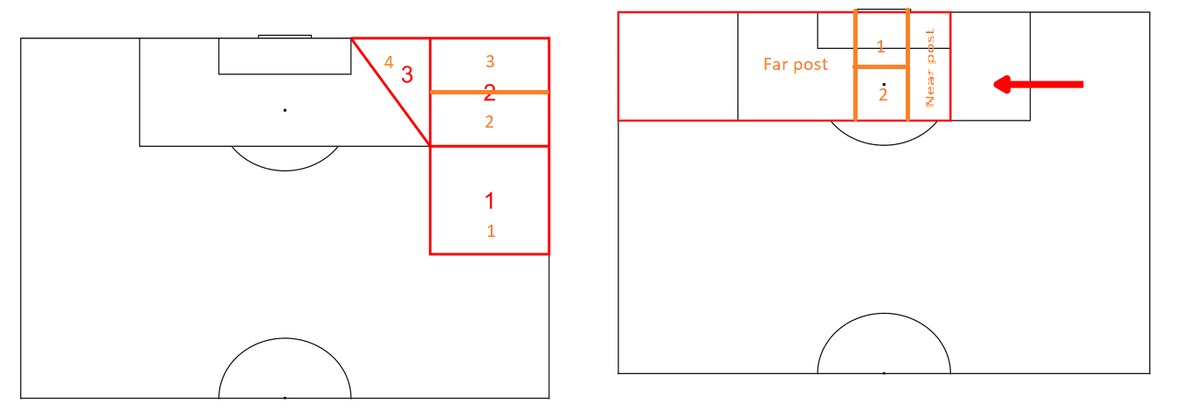 Statsbomb, чьими данными мы будем пользоваться в рамках исследования, ограничивает координаты начала кросса флангом финальной трети, а также кусочком полуфланга внутри штрафной. Изначально эти участки размечены на три зоны, однако мы разделим зону 2 на две равные части — итого получится четыре зоны.