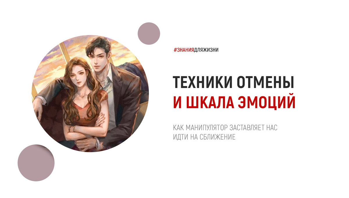 ОТМЕНА. Все техники ОТМЕНЫ являются некой квинтэссенцией «Ближе-Дальше». Мы уже говорил о технике «Ближе-Дальше». Вначале этапа «сближение» (первое длительное общение) манипулятор делает максимальное «Ближе». Вовремя приходить на встречу, шутит, читает, рассказывает, при этом слишком высокую заинтересованность не проявляет. То в «отношениях» техника «Ближе-Дальше» в разных вариациях приобретает другой смысл. Что такое «Ближе-Дальше»? Представим, что наши эмоции в отношениях можно померить по шкале: плюс сто - максимальный позитив до минус сто - самый большой негатив: разрыв. Когда манипулятор делает «Ближе» это плюс пятьдесят, когда делает продвинутое «Ближе» это восемьдесят. Теперь представь, что происходит резкое падение эмоций - безпричинно, например от пятидесяти к тридцати – это и есть «Дальше». Вариации падения шкалы эмоций используют для того, чтобы держать жертву в напряжении. Их применение начинается, как правило, сразу после секса. Например, он приходит к тебе и вы общаетесь