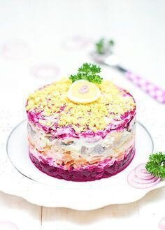 Салат "Под шубой" - это излюбленное блюдо русской кухни на праздничных столах. Рецепт этого салата довольно прост, а результат всегда удивляет гостей и домашних. Вот как приготовить салат "Под шубой": Ингредиенты: - 3-4 картофелины - 3-4 морковки - 3 свежих свеклы - 2-3 яйца - 2-3 луковицы - 300 г цветной капусты - 200 г маринованных огурцов - 200 г свежей зелени (укроп, петрушка) - 300 г майонеза - соль и перец по вкусу Приготовление: 1. Очистите и нарежьте картофель, морковь и свеклу кубиками. 2. Подготовьте кочан цветной капусты, вырвав крупные куски, нарежьте его тонкими ломтиками. 3. Варите яйца до готовности, очищаете их, разрезаем пополам и вынимаем желтки. 4. Лук нарезаем тонкими полукольцами. 5. Нарежьте маринованные огурцы тонкими кружочками. 6. Возьмите глубокую сложенную форму для салата, распределите на дно половину свеклы, выложите ее равномерным слоем, смажьте майонезом. 7. Затем выложите на слой свеклы половину лука, затем слой моркови и горсть тертых желт