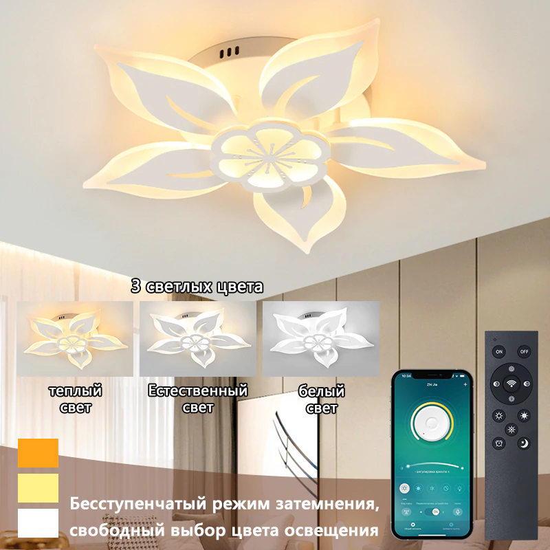Открывает нашу подборку такая габаритная, стильная и многофункциональная люстра с возможностью дистанционного управления. Товар без труда сопрягается с умным домом, что также выступает преимуществом люстры.